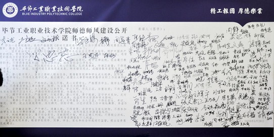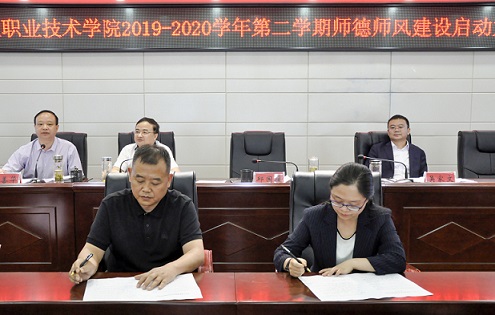 會(huì)上,院長(zhǎng)與副院長(zhǎng),副院長(zhǎng)與分管部門(mén)負(fù)責(zé)人,部門(mén)負(fù)責(zé)人與所屬教職員工層層簽訂師德師風(fēng)責(zé)任書(shū);全院教職員工就師德師風(fēng)建設(shè)作出公開(kāi)承諾并簽名。