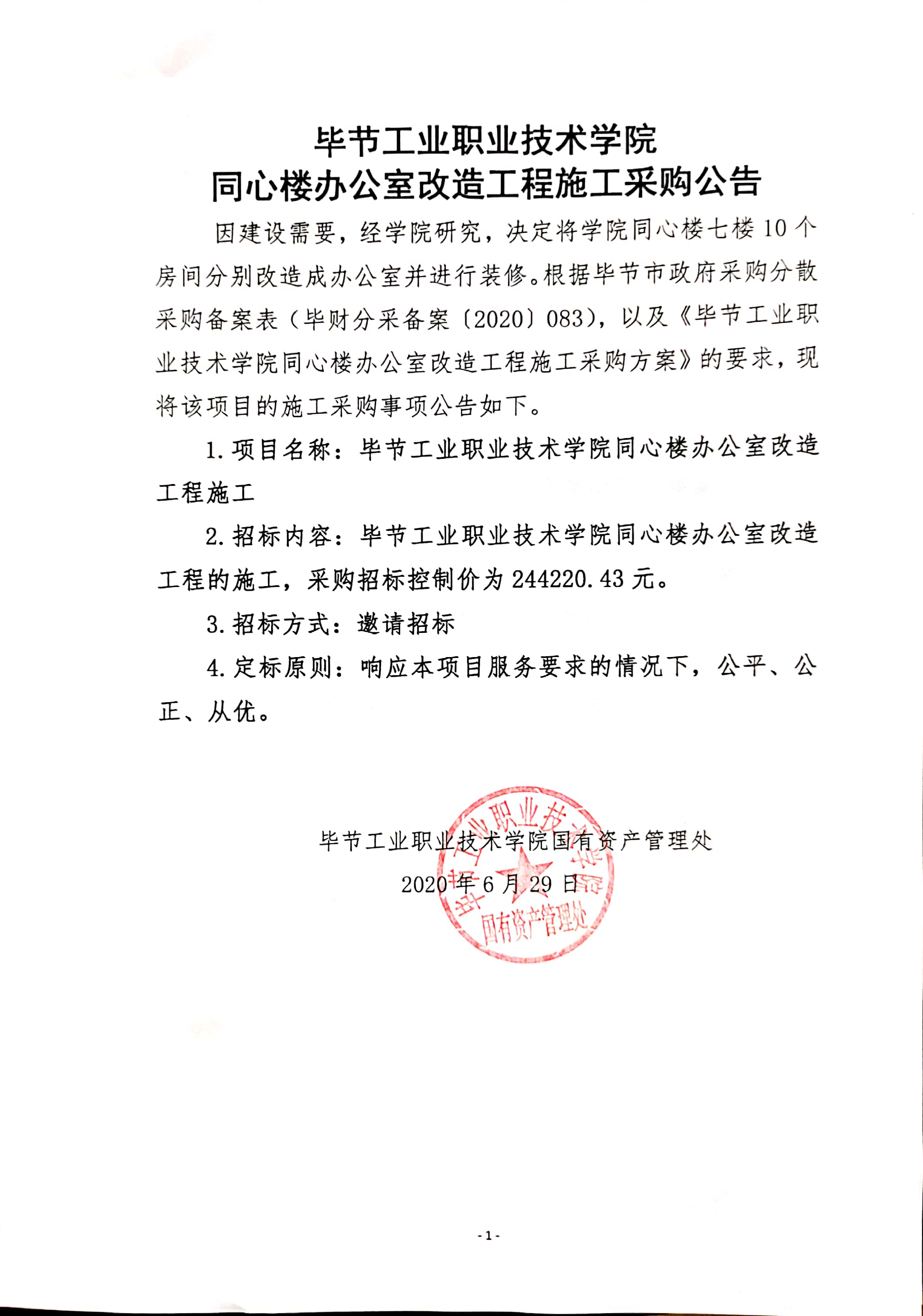 畢節(jié)工業(yè)職業(yè)技術(shù)學院同心樓辦公室改造工程施工采購公告