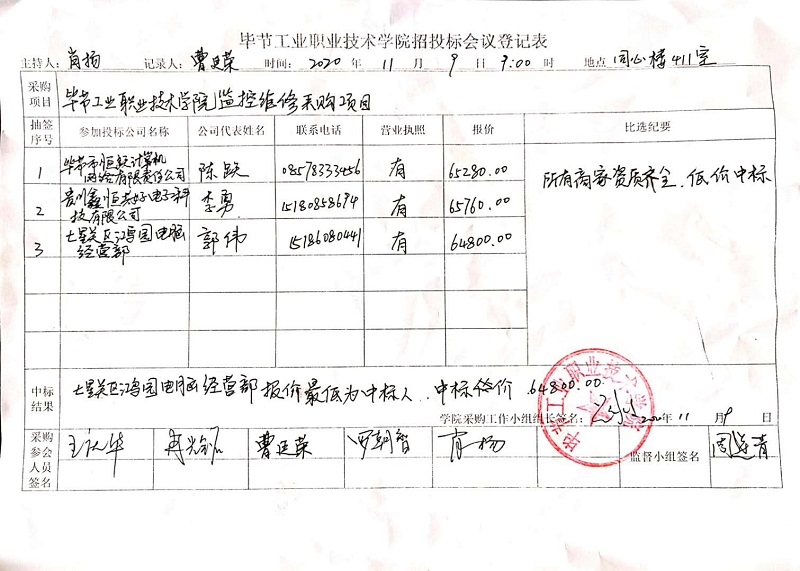 畢節(jié)工業(yè)職業(yè)技術學院監(jiān)控維修采購項目中標公告