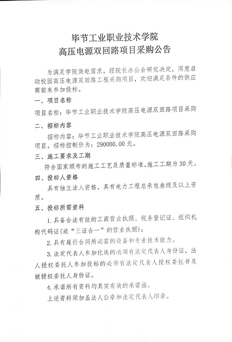 畢節(jié)工業(yè)職業(yè)技術(shù)學院高壓電源雙回路項目采購公告