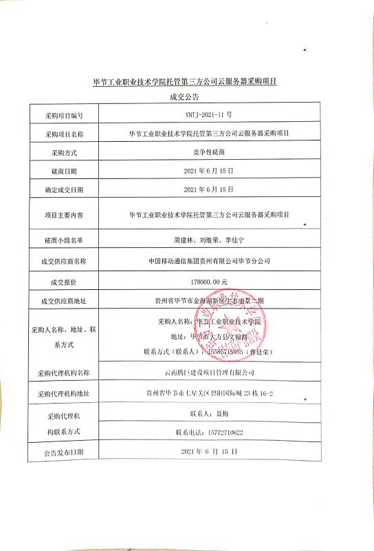畢節(jié)工業(yè)職業(yè)技術(shù)學(xué)院托管第三方公司云服務(wù)器采購項目成交公告