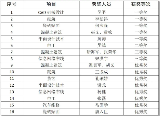 近年來,我院一直注重發(fā)揮技能大賽在促進(jìn)“三教”改革,提升人才培養(yǎng)質(zhì)量中的引領(lǐng)作用,不斷完善人培方案和人才培養(yǎng)體系,加強(qiáng)以賽促教、以賽促學(xué)、以賽促訓(xùn)、以賽促建,有效促進(jìn)了產(chǎn)教深度融合發(fā)展、校企密切合作育人,職業(yè)教育培養(yǎng)質(zhì)量顯著提升。 (頒獎(jiǎng)現(xiàn)場(chǎng)) 本次比賽榮獲佳績(jī),進(jìn)一步激發(fā)了我院師生學(xué)習(xí)技術(shù)、鉆研業(yè)務(wù)的熱情,多層次促進(jìn)了師生整體素質(zhì)和技能水平的提升。 (我院部分獲獎(jiǎng)師生合影) 今后,我院將再接再厲,努力打造一支技藝精湛、素質(zhì)良好的人才隊(duì)伍,為今后的各級(jí)技能大賽作準(zhǔn)備,為畢節(jié)市經(jīng)濟(jì)社會(huì)高質(zhì)量發(fā)展提供有力的技能人才支撐。 (我院獲獎(jiǎng)情況一覽表)