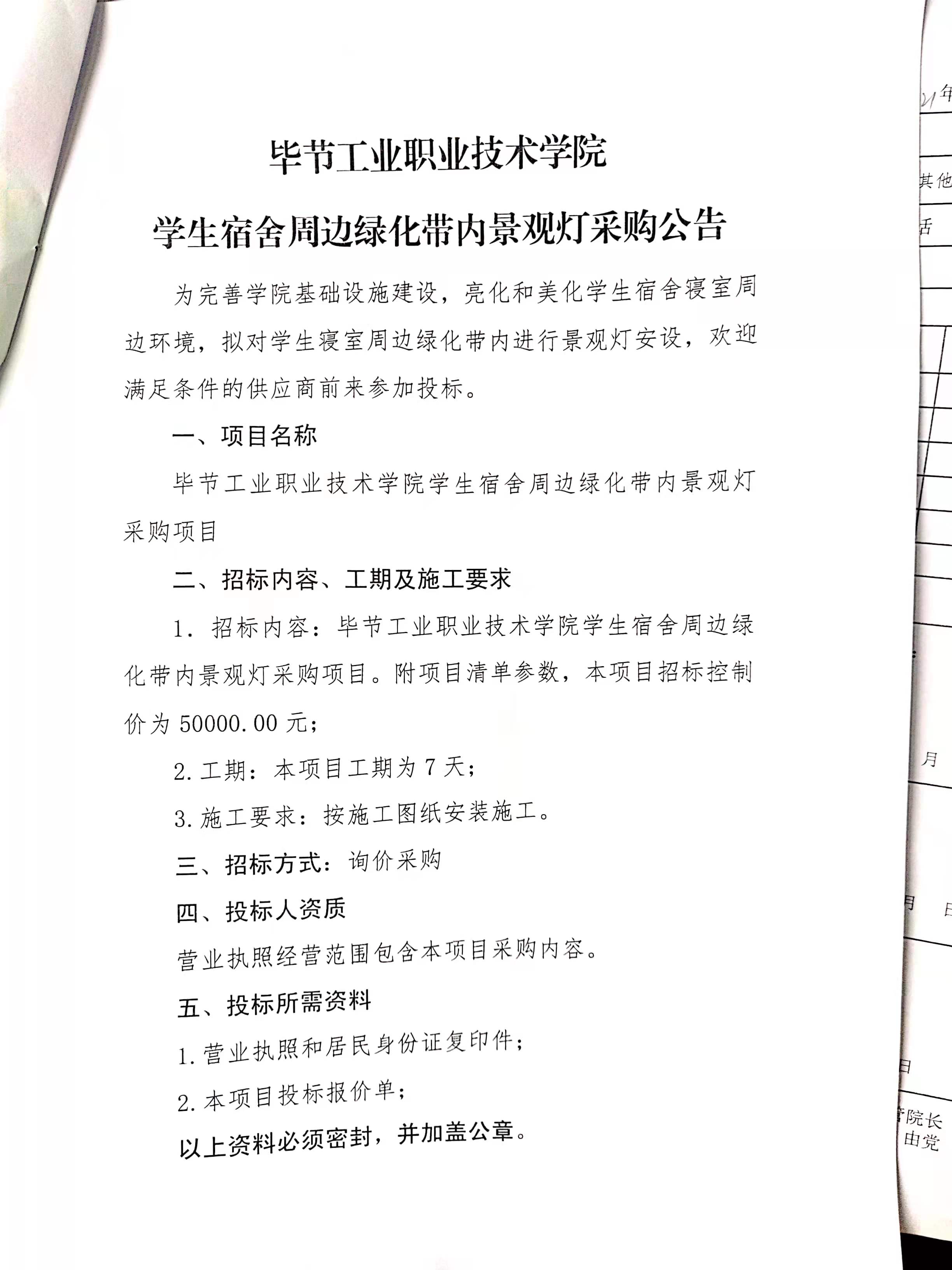 畢節(jié)工業(yè)職業(yè)技術(shù)學(xué)院學(xué)生宿舍周邊綠化帶內(nèi)景觀燈采購公告