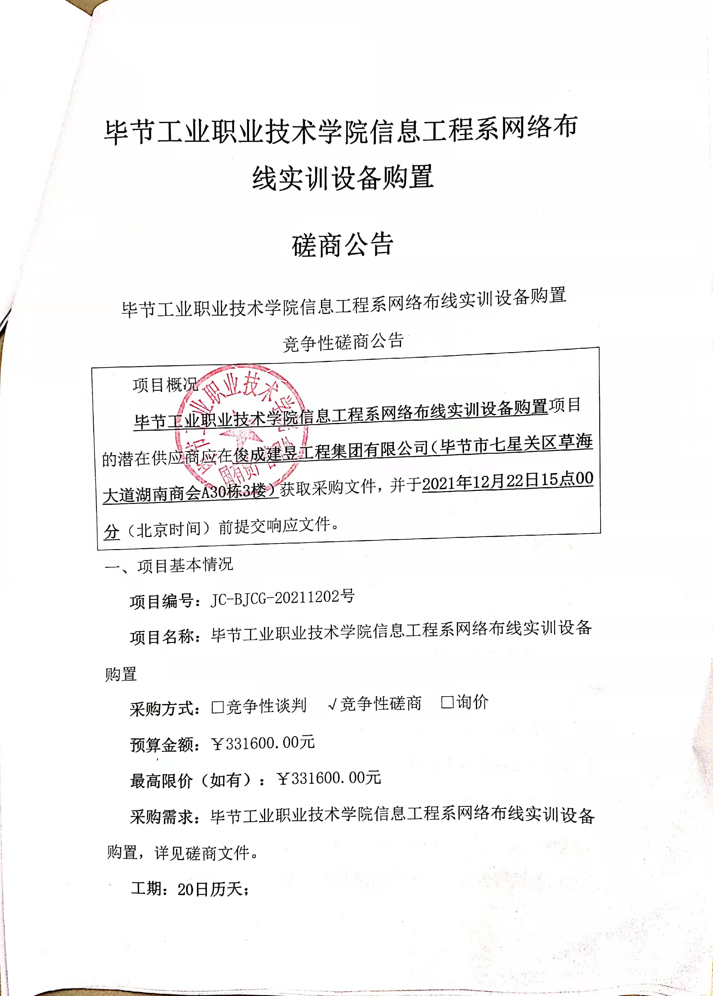 畢節(jié)工業(yè)職業(yè)技術(shù)學(xué)院信息工程系網(wǎng)絡(luò)布線實(shí)訓(xùn)設(shè)備購置磋商公告
