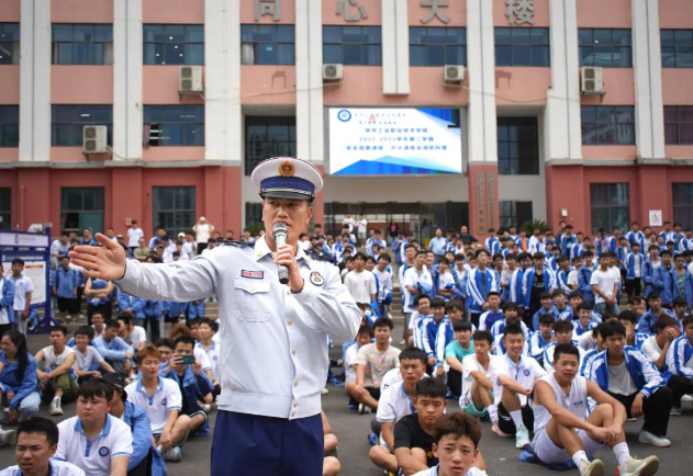 演練中,學生代表還實地體驗了使用消防救生梯逃生的應急處置流程,直觀地體驗面對危險時的正確自救方法以及冷靜有序的撤離。 演練結(jié)束后,消防員給學生普及了消防知識,金海湖消防大隊隊長朱海以真實案例將消防安全知識深入淺出地進行講解,介紹了校園常見火災發(fā)生的原因及防范措施,講解了使用滅火器撲救初期火災方法。 朱海在總結(jié)演練過程時指出,整個演練安全、高效、有序,達到了預期目標,取得了明顯的成效,檢驗了學院的消防工作。他要求,全體師生要牢固樹立安全防范意識,熟練掌握防踩踏規(guī)范動作,學會自我保護的方法,確保在發(fā)生突發(fā)情況時應急工作能快速、高效、有序地進行,從而最大限度地保護全體師生的生命安全,減少不必要的傷害。 學院黨委委員、副院長黃河結(jié)合校園安全工作實際情況,提出三點要求:一是要求廣大師生牢固樹立“安全第一、生命至上”的理念,強化安全紅線意識,在思想上繃緊安全這根弦;二是要求廣大師生認真對待,珍惜這次全疏散演練、滅火演練及消防科普活動的機會,掌握在緊急情況下迅速逃生、自救、互救的基本技能,提高應對火災突發(fā)應對能力;三是要求相關(guān)職能部門要堅持強化安全防范,堅持把校園安全隱患排查整治作為一項重要工作常抓不懈、警鐘長鳴,真正做到防患于未然,有效預防和堅決遏制安全事故的發(fā)生。