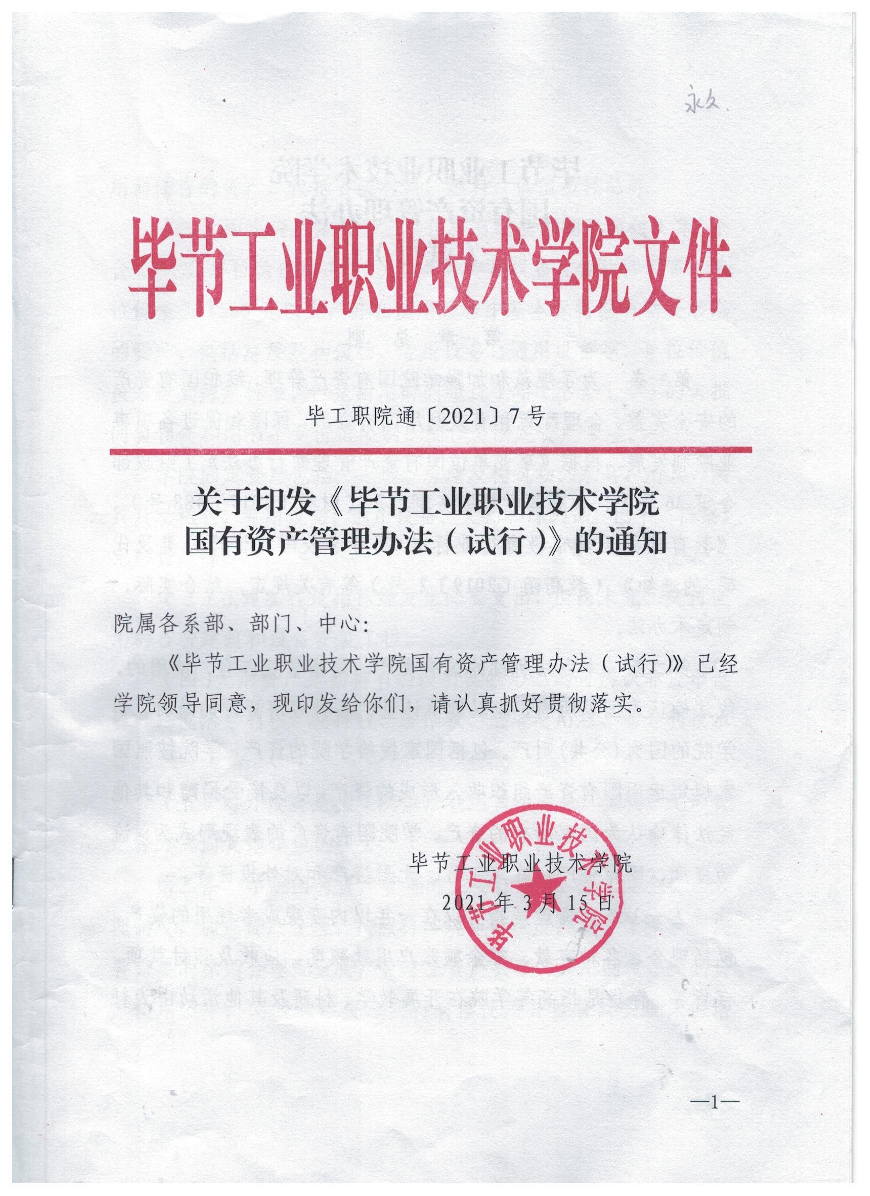 關(guān)于印發(fā)《畢節(jié)工業(yè)職業(yè)技術(shù)學(xué)院國(guó)有資產(chǎn)管理辦法(試行)》的通知