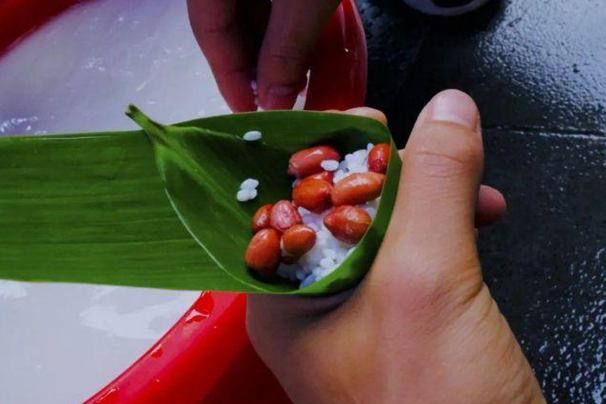看著同學(xué)們嫻熟的手法,捻起一片粽葉,三兩下卷成漏斗狀,再舀起一勺米和紅棗倒入粽葉中,隨后用粽葉把糯米包裹緊實(shí),系上繩子,一顆顆肥碩的粽子就這樣完成了。