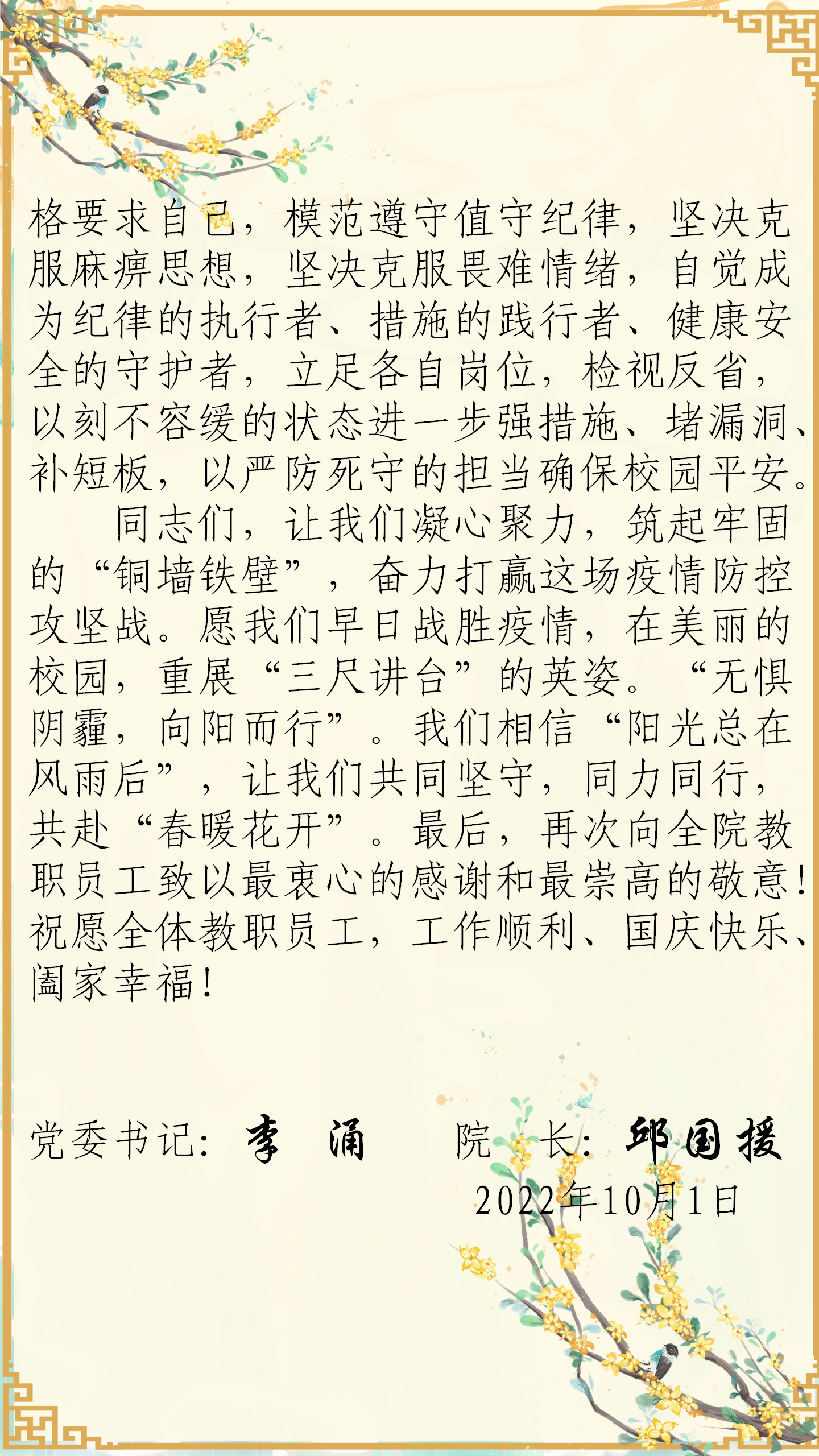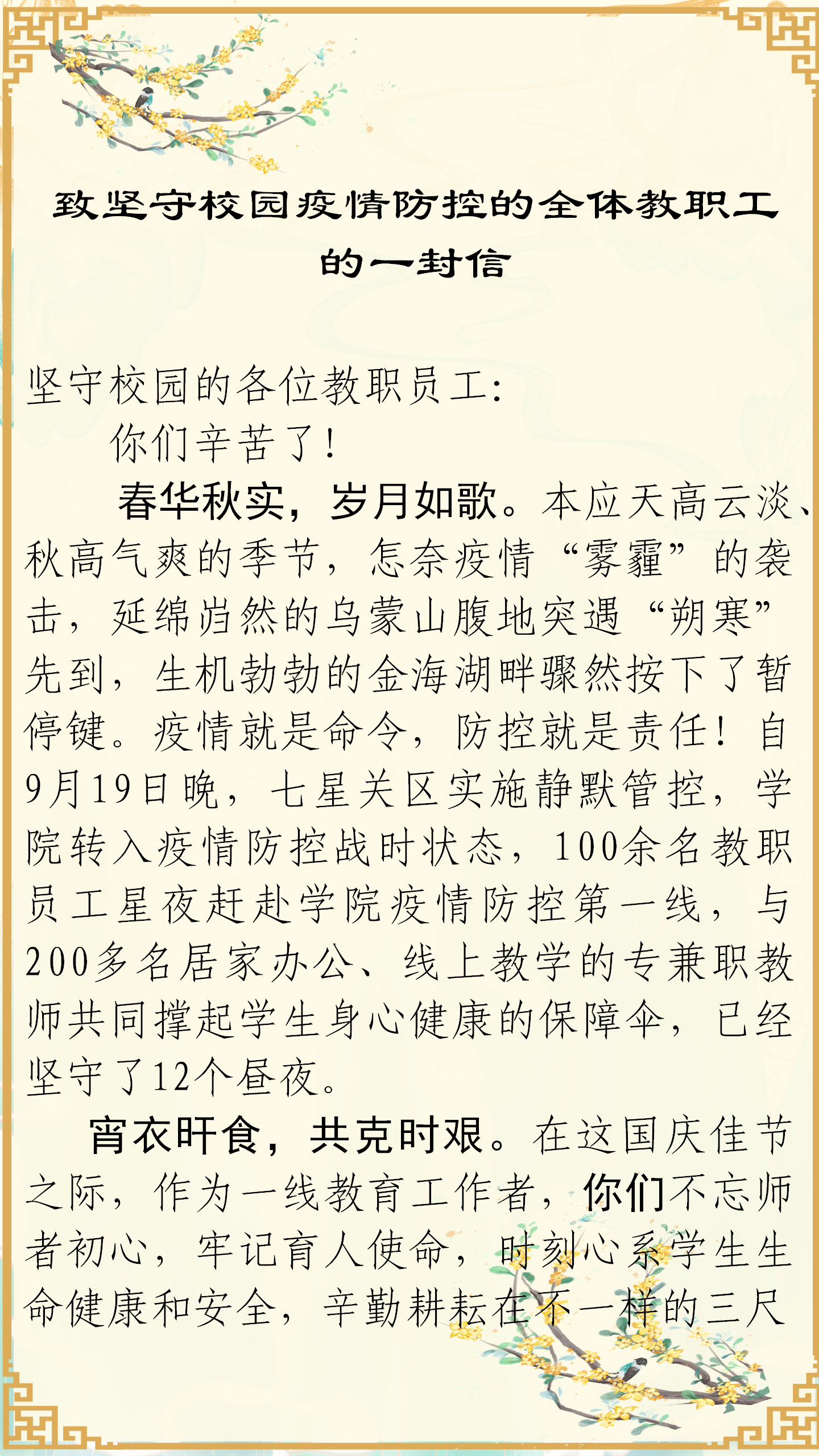 致堅守校園疫情防控的全體教職工的一封信