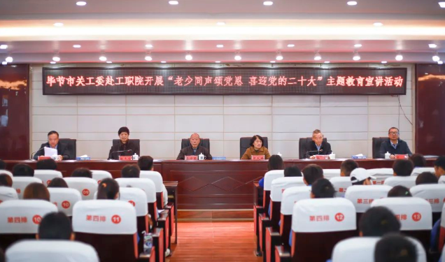 5月20日,畢節(jié)市關(guān)工委主任周長琦、副主任吳學香、楊旭、張志俠、梁軍一行受邀赴我院開展“老少同聲頌黨恩·喜迎黨的二十大”主題教育宣講,并實地調(diào)研我院辦學情況。學院黨委班子成員李涌、邱國援、付善華、黃文碧、申開谷,工會、婦聯(lián)主席李淑文及相關(guān)部門人員陪同調(diào)研。宣講會由黨委副書記付善華主持,學院師生代表200余人聆聽宣講。