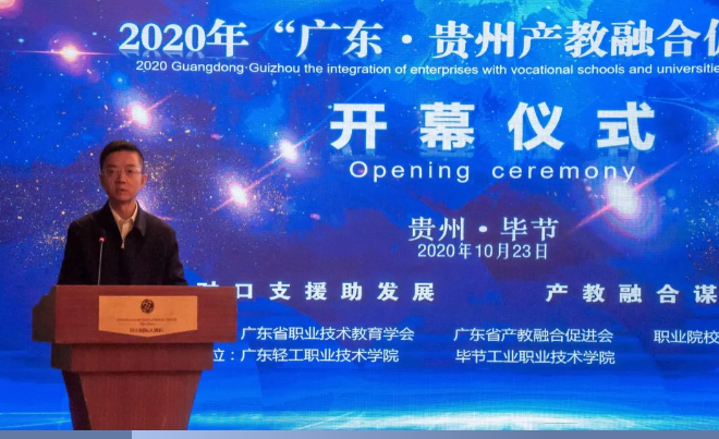 10月23日,廣東?貴州產(chǎn)教融合促進(jìn)大會(huì)在畢節(jié)隆重召開(kāi)。廣東省教育廳巡視員朱俊文,貴州省教育廳一級(jí)巡視員鞠洪出席會(huì)議并致辭,畢節(jié)市委常委、副市長(zhǎng)胡愛(ài)斌致歡迎辭,廣東輕工職業(yè)技術(shù)學(xué)院黨委書記杜安國(guó)作介紹,會(huì)議由畢節(jié)工業(yè)職業(yè)技術(shù)學(xué)院黨委副書記、院長(zhǎng)邱國(guó)援全程主持。廣東省教育廳、貴州省教育廳、廣州市教育局、畢節(jié)市教育局相關(guān)負(fù)責(zé)人及參與產(chǎn)教融合大會(huì)的校企單位主要負(fù)責(zé)人參加會(huì)議。此次會(huì)議由廣東省職業(yè)技術(shù)教育學(xué)會(huì)、廣東省產(chǎn)教融合促進(jìn)會(huì)、職業(yè)院校協(xié)同發(fā)展聯(lián)盟主辦,廣東輕工職業(yè)技術(shù)學(xué)院、畢節(jié)工業(yè)職業(yè)技術(shù)學(xué)院承辦。